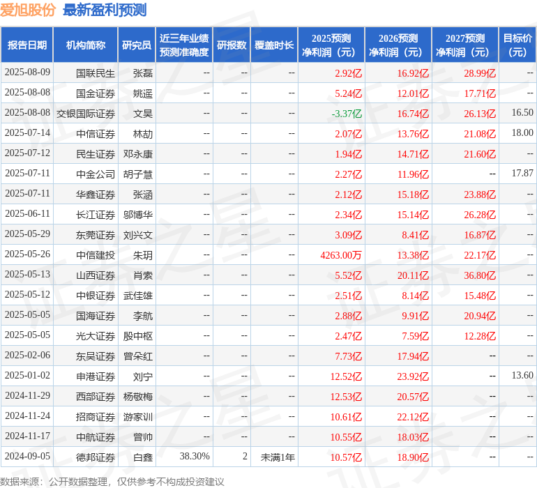 最新盈利预测明细如下: