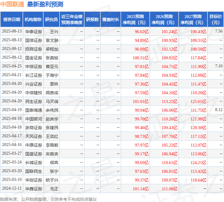 中国银河证券股份有限公司赵良毕,赵中兴近期对中国联通进行研究并发布了研究报告《中国联通2025半年度业绩点评:高科技成长,高股息回报》,给予中国联通买入评级。