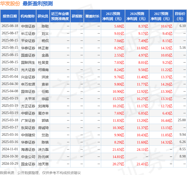 最新盈利预测明细如下: