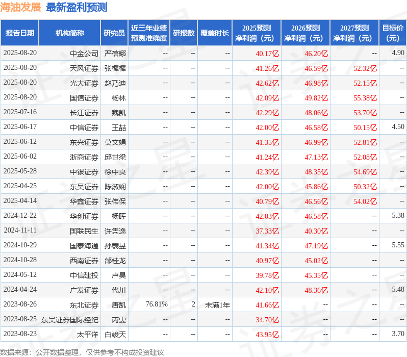华鑫证券有限责任公司张伟保,覃前近期对海油发展进行研究并发布了研究报告《公司事件点评报告:积极布局深海科技,三大主业作业量平稳增长》,给予海油发展买入评级。