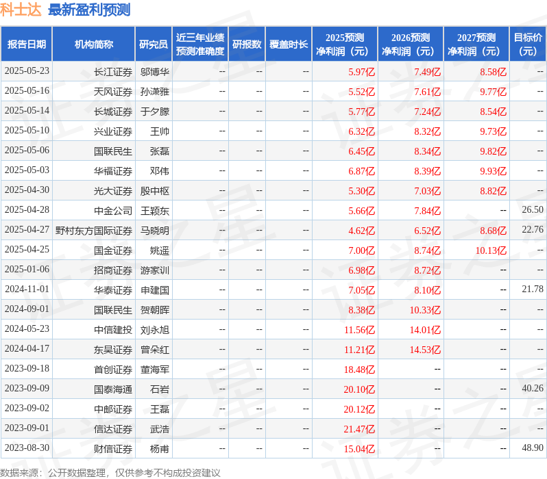 最新盈利预测明细如下: