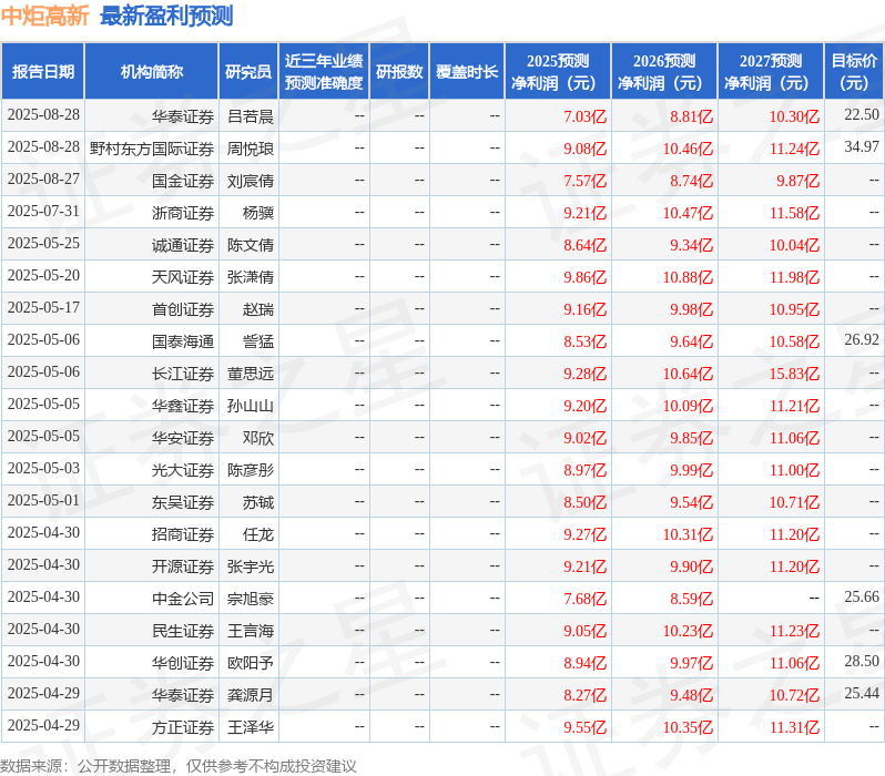 最新盈利预测明细如下: