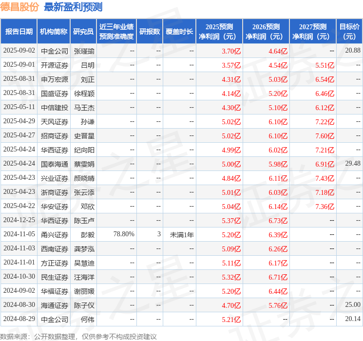 最新盈利预测明细如下: