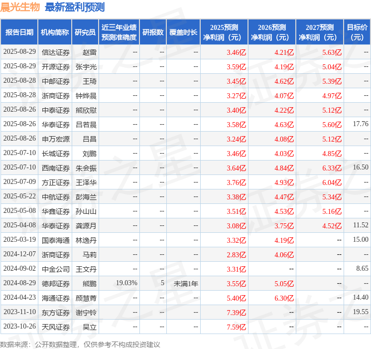 最新盈利预测明细如下: