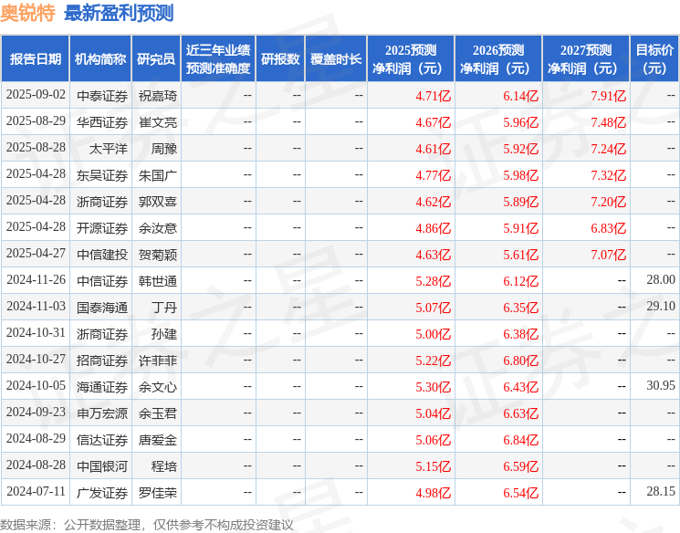 最新盈利预测明细如下: